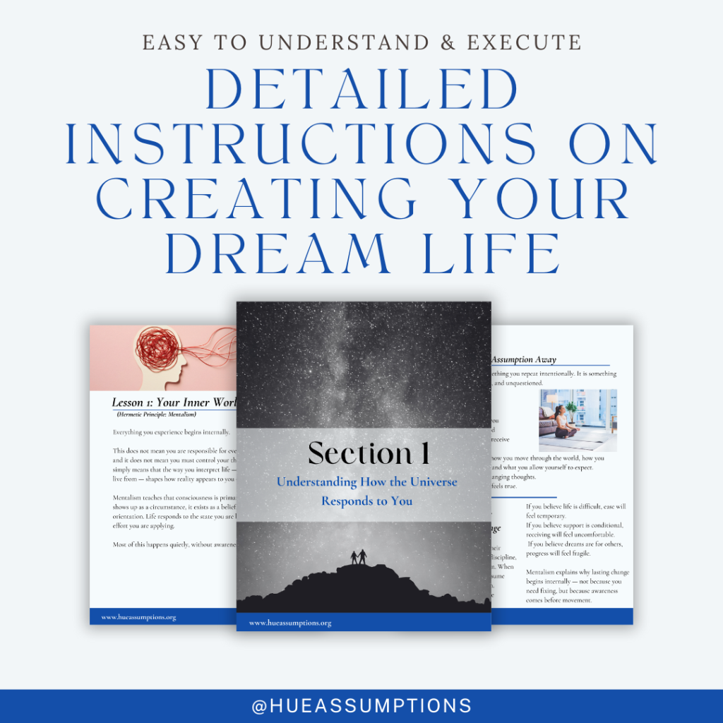 This guided, step-by-step workbook blends timeless principles — including the Hermetic teachings and Universal Laws — with practical, nervous-system-aware practices designed to help you shift from effort to ease. You’ll learn how your inner world shapes your experience, how your assumptions influence what you attract, and how to allow your dream life to unfold naturally from a place of calm confidence.