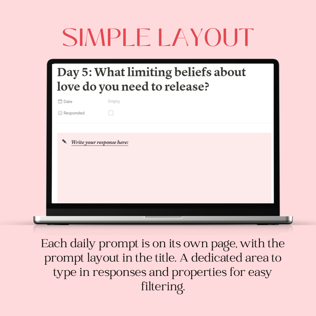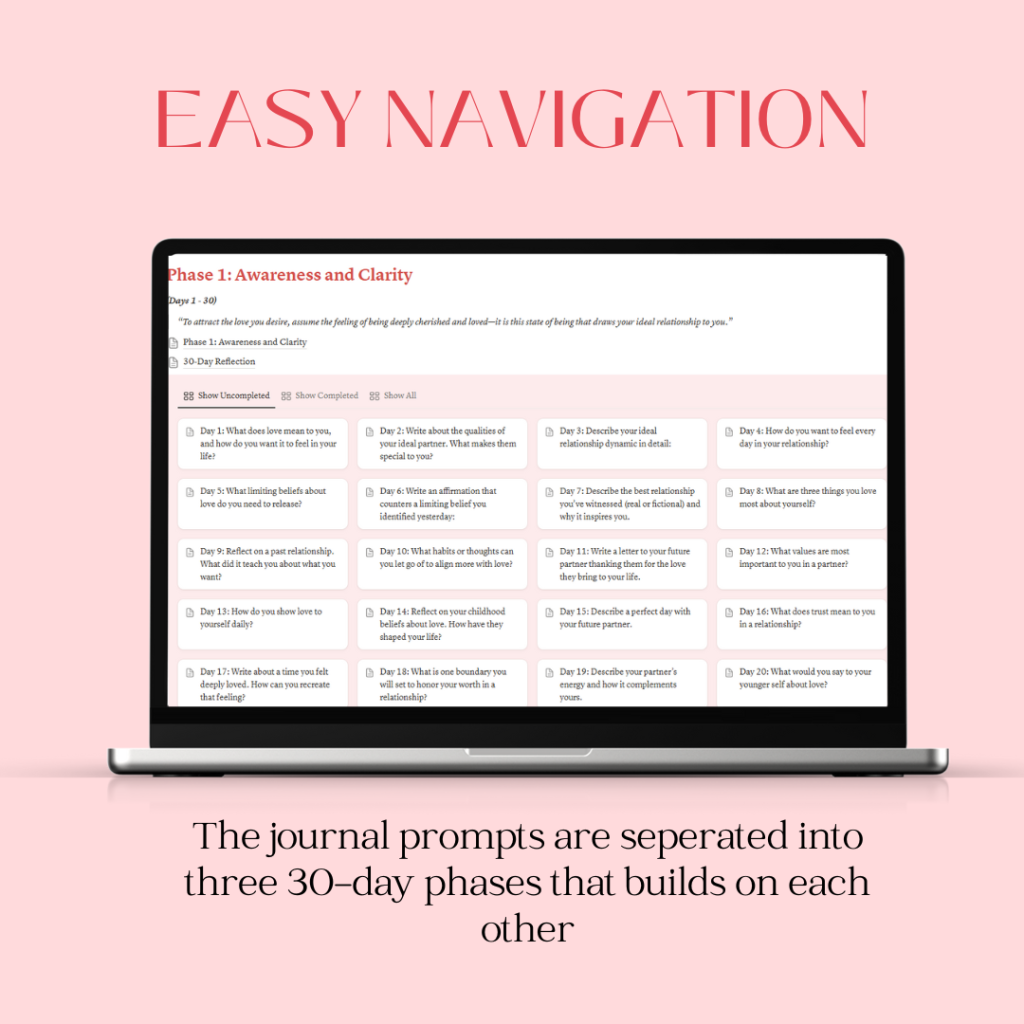 A beautifully structured 90-day Notion journal designed to help you release old relationship patterns, regulate your emotions, and step into the identity of a woman who is loved deeply, consistently, and intentionally. Perfect for women ready to attract aligned love — or elevate the relationship they already have.